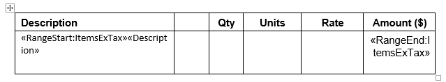 The new tables are defined within RangeStart and RangeEnd fields. At the start of the table (row the data starts on and column 1), you must enter the RangeStart field. E.g. «RangeStart:ItemsExTax». Note, the :ItemsExTax comes from the Get fields list screen as shown below.
