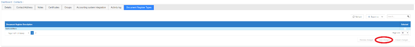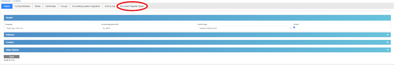 Now that the document types are set up, the suppliers/contractors who will be receiving these documents need to be linked to document type/s. To do this, go to the ‘Contacts list’ and select a supplier and click EDIT, select the new tab ‘Document Register Types’.