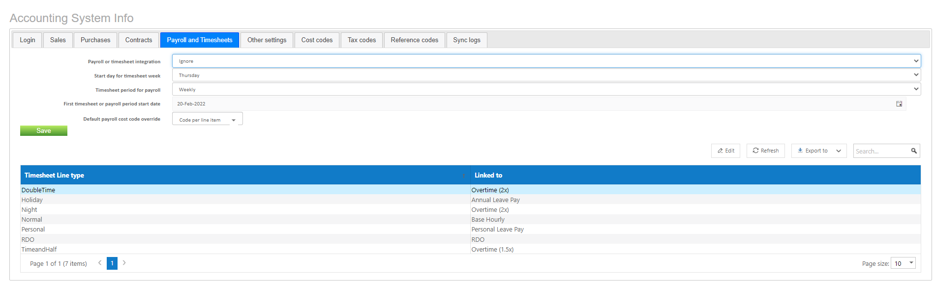 The Timesheet Line Types are standard and need to be linked to the correct MYOB Categories via the Edit button.