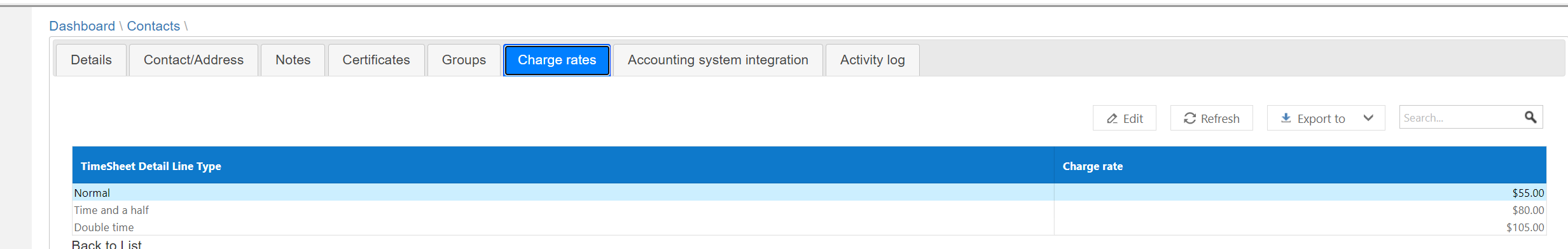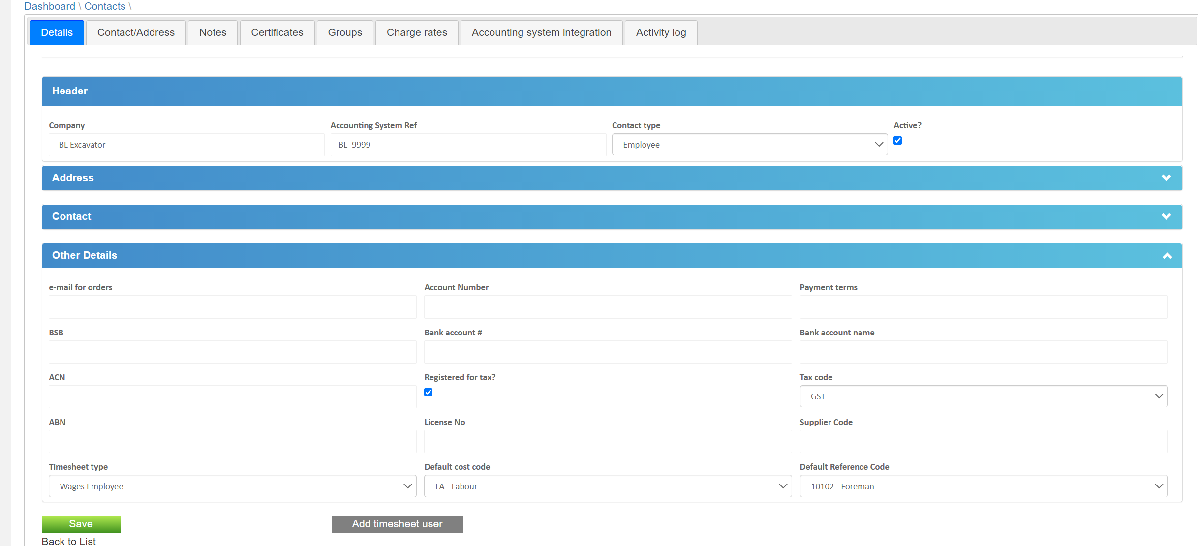 When setting up the contact there are a couple of areas that are critical for the integration to work correctly. Firstly, on the Details tab at the bottom of the screen is where is where the user’s timesheet type, Default Cost Code and Default Reference Code are set up. Select the Save Button.