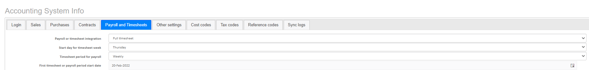 - The first task is to ensure that the following tab against your accounting system is set up correctly and looks similar to the screenshot below. The top section of the screen is self-explanatory.