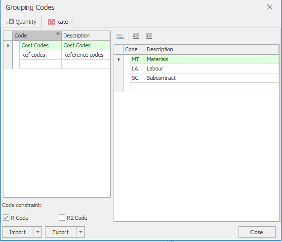 - When the Ref codes list group is selected, tick the R2 code box at the bottom of the window and when the Cost code group is selected, tick the R code box.