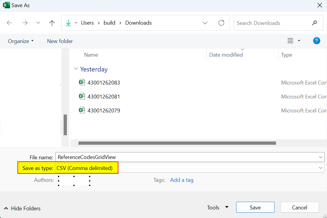 Once you have exported and cleaned up the excel file, save it as a .csv file by hitting 'save as' in the excel document and changing the 'save as type' to .csv