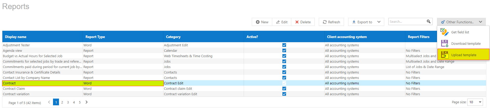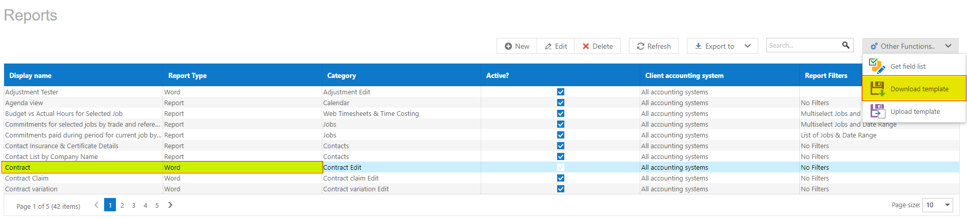 For this example I am using the 'Contract' Template; highlight the contract line and open the other functions menu, select download template