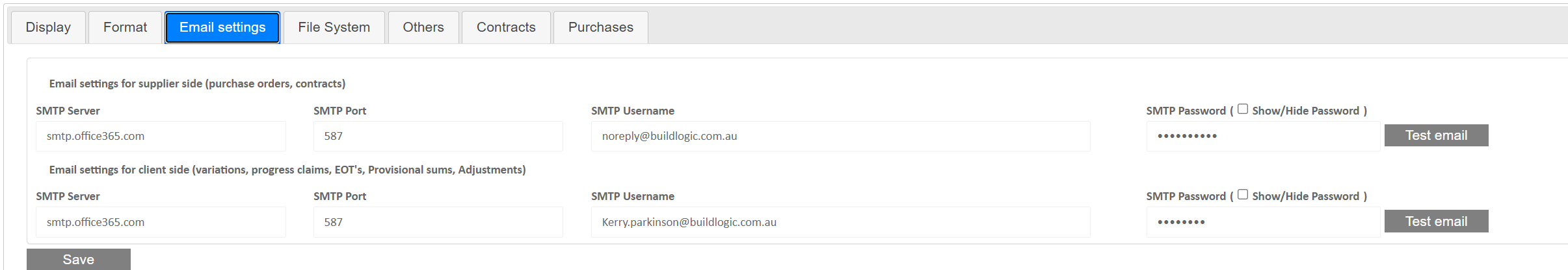 3. Client Administrator Function - 2nd email account - in this release, if you are wanting to send out emails from within Buildlogic, you have been able to do this for bulk Purchase Orders via 1 SMPT address. You can now have a 2nd email account if you want to send out from a generic account. For example, you may want all your Progress Claims to go out via an accounts email.
