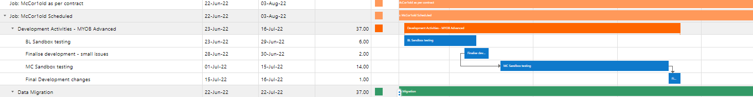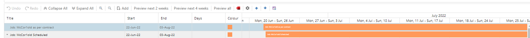 The blue bar shows the job number, the start and end dates, Sort ID, Colour and Days (duration of the task). The start and end days are taken from the start and end dates that are set against the job.