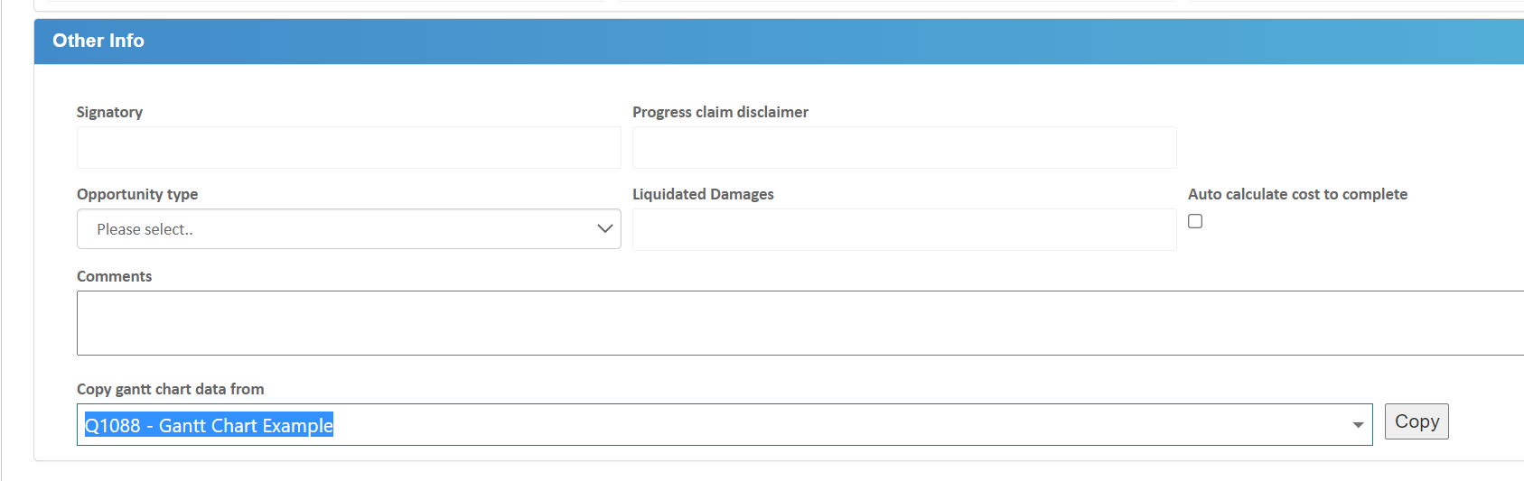 If you have set up a Gantt Chart against one job in Buildlogic, and you want to use the same format for other jobs, there is a new copy function on the Job/Edit – Details Tab/Other info where you can pick an existing job with a Gantt Chart and copy the Gantt Chart into the new job.