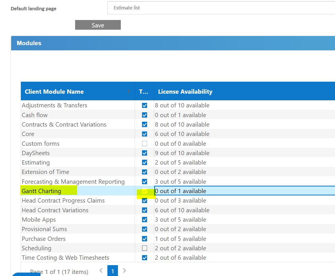 Buildlogic Client Administrator function - once you have been notified that the license count has been added, please go to System/User and License and highlight the user(s) who need access and select Edit. When the module list is displayed for each user, highlight the module called Gantt Charting and tick the box and select Save Changes.