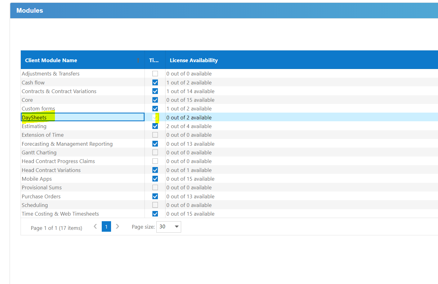 1.1 Buildlogic Client Administrator function - once you have been notified that the license count has been added, please go to System/User and License and highlight the user and select Edit. When the module list is displayed, highlight the module called Day Sheets and tick the box and select Save Changes.