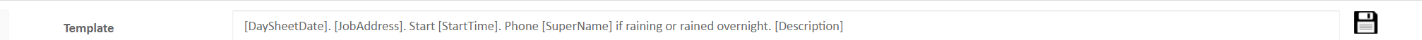 - Template – at the top of the screen is a section called Template. When sending info out from the Day Sheet via SMS or email, this allows you to tailor the information the users require for the next day. The items inside the brackets should not be changed but the general wording can be. If you make a change, click on the small icon on the right to save the new information.