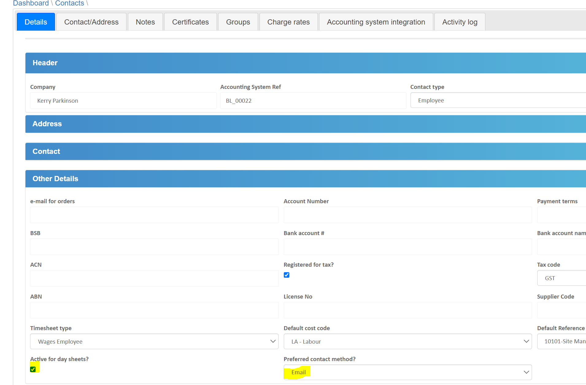 Also, against the employee’s card in Contacts, there is an Active for day Sheets tick box plus a second box of what is the preferred contact method.