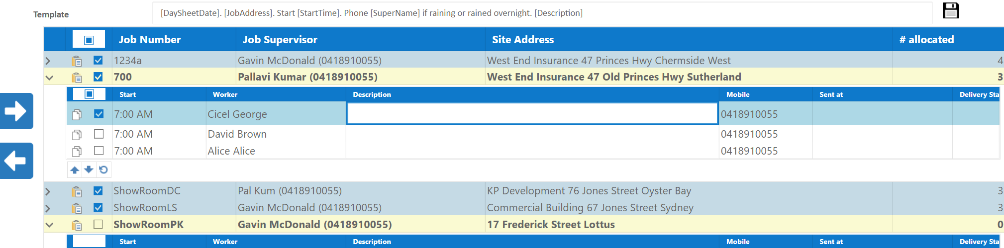 - The small arrow against each job allows you to open up or close the details about workers. The information displayed for workers is Start time, Worker, Description, Mobile/Email, Sent at and the delivery status.