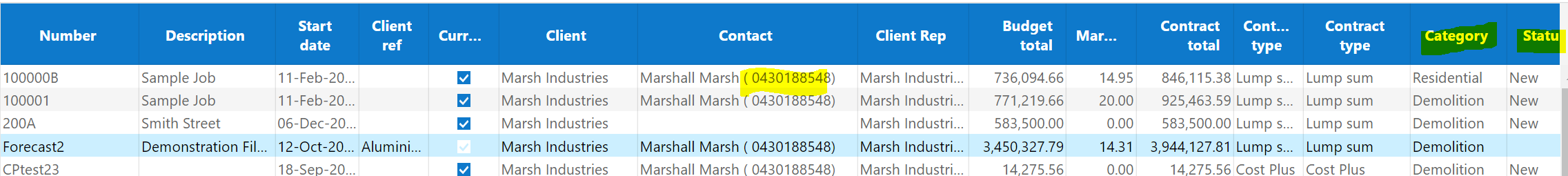 1. Estimating -New Columns and information in Estimate List - 2 new columns have been added to the Estimate List plus the contacts phone number is next to the contact's name.. The new columns are Status and Category.