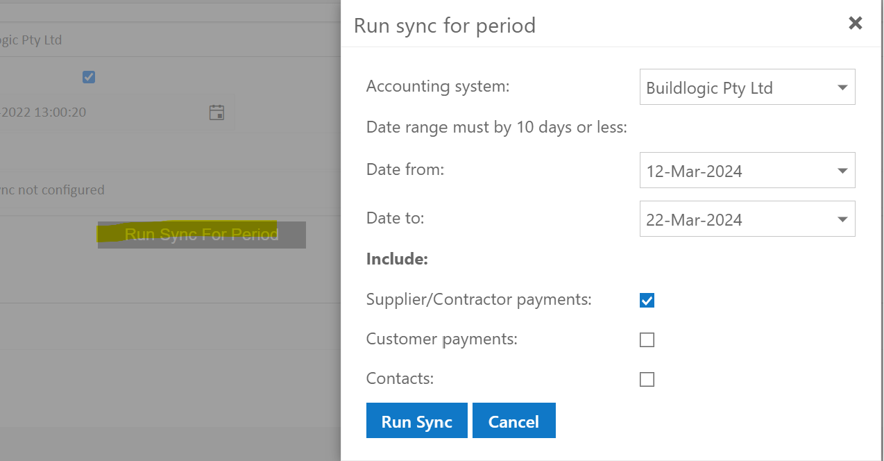 When you select the Run Sync for Period, the box below pops up. This will run a Sync only for the dates specified and must be 10 days or less. This will alleviate the need to run a full sync if say a payment is not showing in Buildlogic.