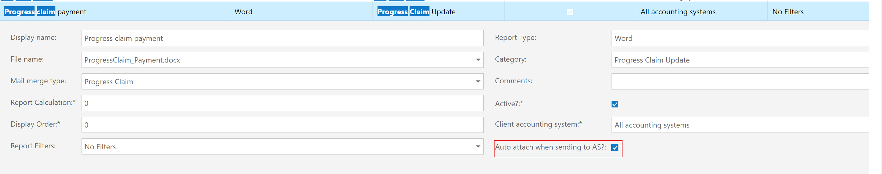1. New function - Ability to attach documents when sending to AS - some clients wanted to send their progress claim document across to their accounting system, when the transaction goes across. Your Buildlogic Administrator can go into Reports/Reports and Templates, find the word template you are using and tick the box as shown below. When you select to send the progress claims, the documentation will be automatically created and also be pushed to your Accounting system with the transaction.
