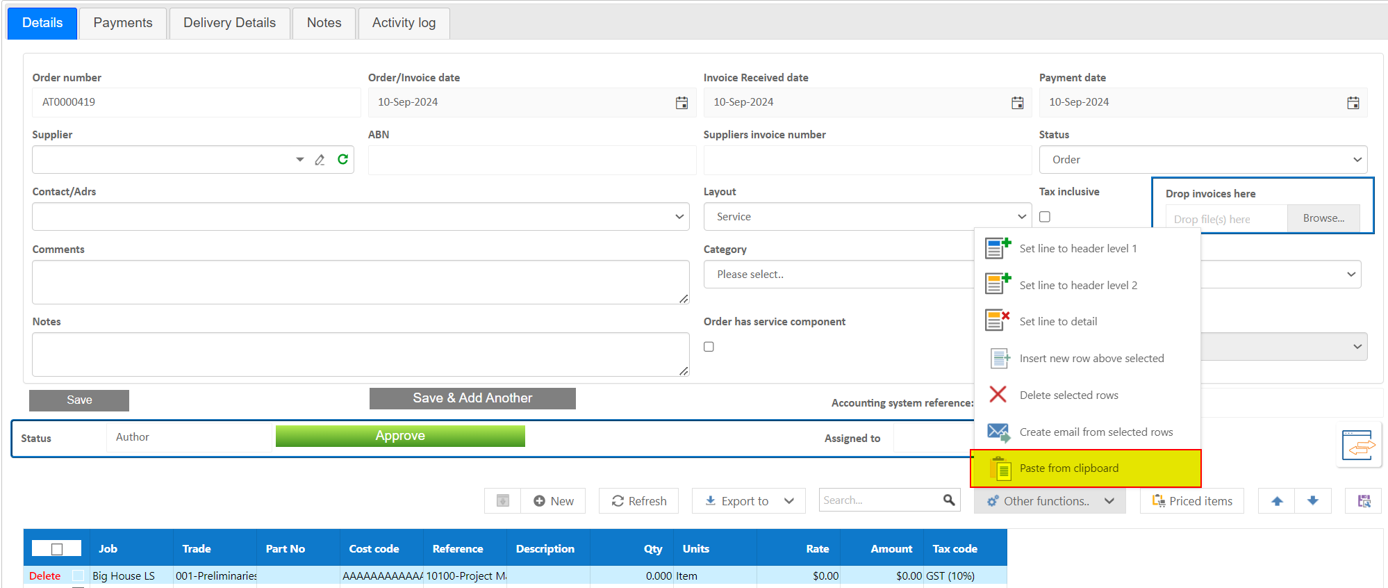 12. Copy/paste data for purchase orders - Users will now be able to copy/paste from excel straight into their purchase detail table, using the below excel document format. Navigate to your other functions menu above the purchase detail table.