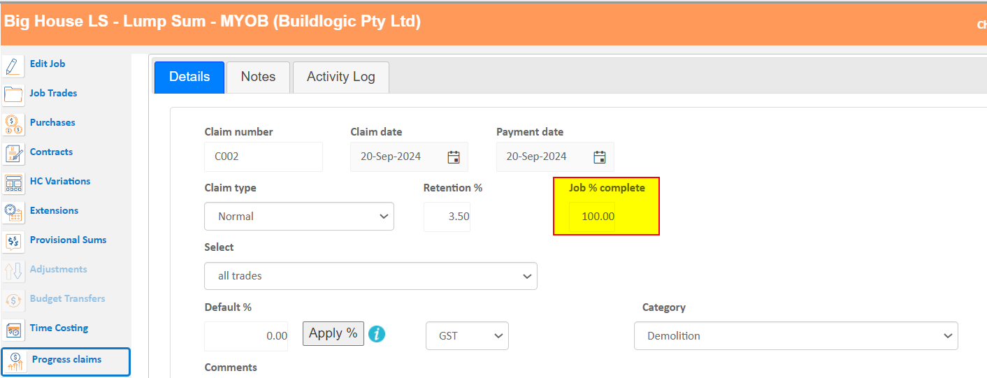 7. Job % Complete added to progress claim detail page - Users can now check their job % complete when creating a progress claim, this will allow users on certain settings such as 'invoices paid' to keep track of how far they are through a job.