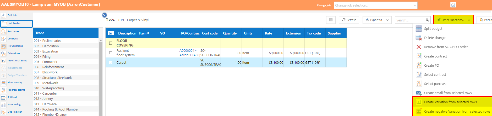 9. Create variation from selected budget row - You can now select rows in the budget and automatically create a positive or negative variation, the system will pull the data from the line into a variation for you automatically, making it easier to add or remove values from a jobs budget.